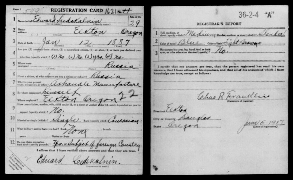 Ed’s World War I draft registration from Elkton, Oregon. World War I marked the first military draft in the United States, and it was common for newspapers to report on who had—and had not—registered.