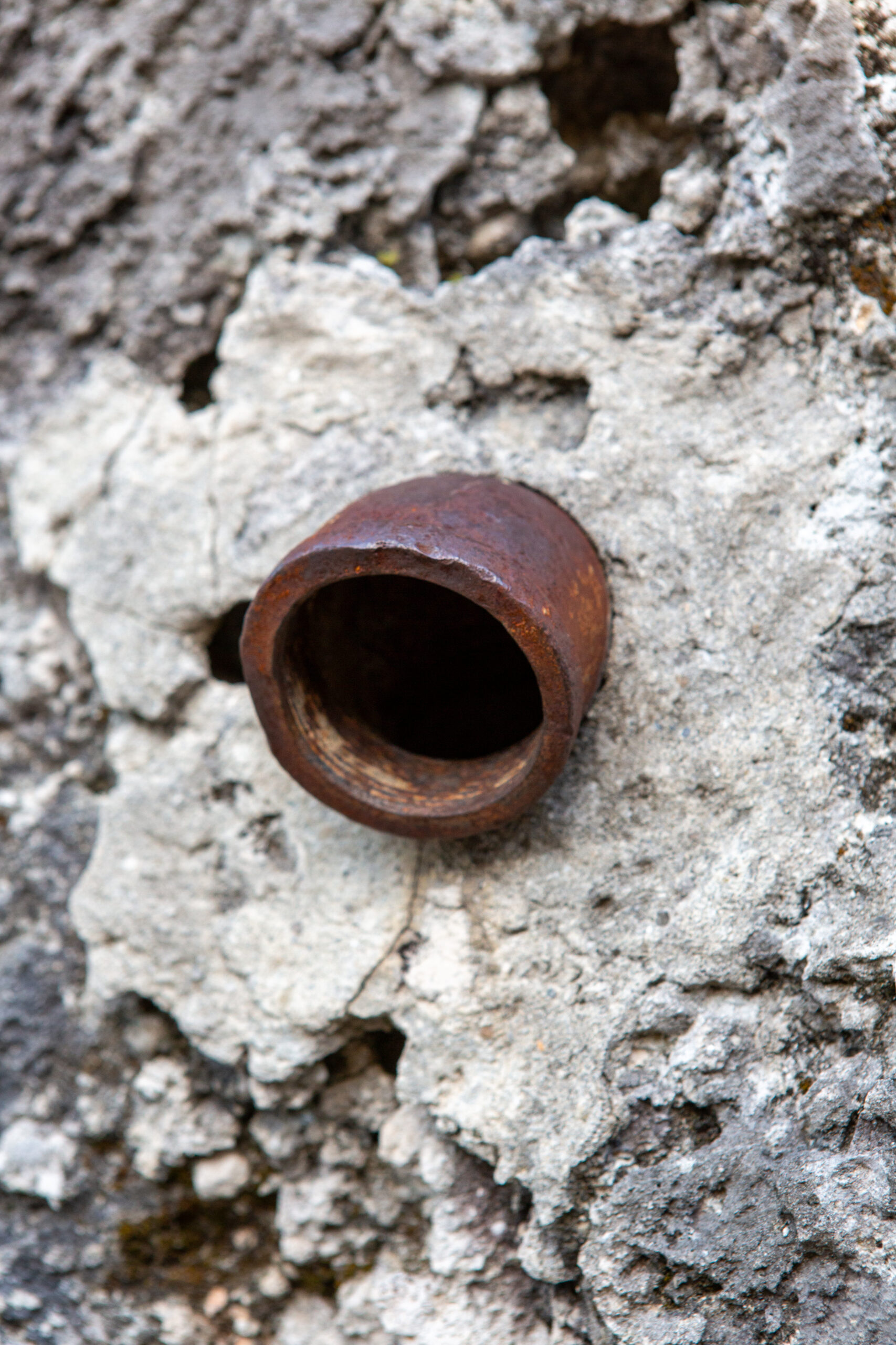 The 10 Cent admission sign at the front entrance to the castle was constructed and moved from its original location near Florida City. It is a self-pay system that features a cast iron water pipe where you can drop a coin in for entry and it would land in a lock box on the backside of the stone. Since Ed was so resourceful, he often repurposed materials for use in his work. The cast iron water pipe was commonly used in residential and commercial construction until the 1950’s. The 10 cent sign measures 6 feet 11 inches high, 3 feet 3 inches wide and is 12 inches thick.