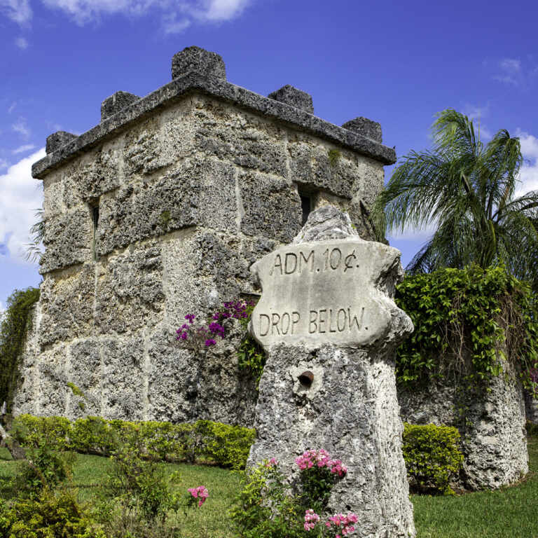 The vintage “10 cent” admission sign was left behind by Ed. A minor price increase to 25 cents per person was triggered by the opening of the Overseas Highway and Florida’s corresponding toll, rendered the sign obsolete. Decades later, during the 1950s, developers transformed Ed’s original site into a housing community. The sign was relocated to its current location in the 1980’s, to preserve this important piece of Coral Castle’s history.