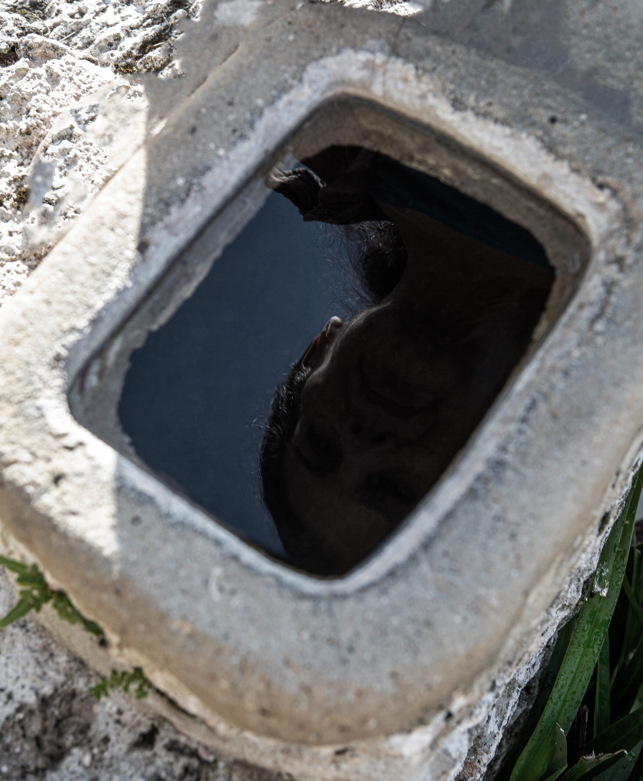 The shaving mirror is a water-filled basin, crafted by Ed and is lined with concrete he mixed using cement, as well as sand and limestone he cultivated from his own backyard. The interior of the basin measures 7 inches wide by 9.75 inches long and 1 foot 5 inches deep. To achieve the desired reflection, the interior is painted black, creating an unexpected yet mirror-like effect. Fill the basin with water, and Ed’s mirror comes alive, offering a glimpse of oneself.