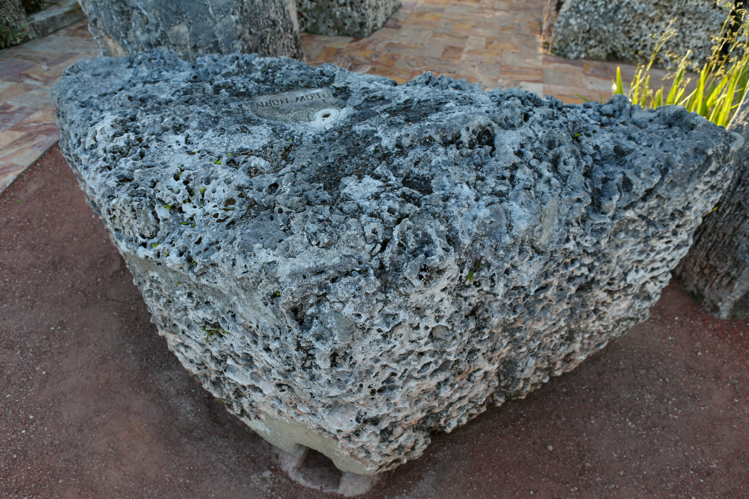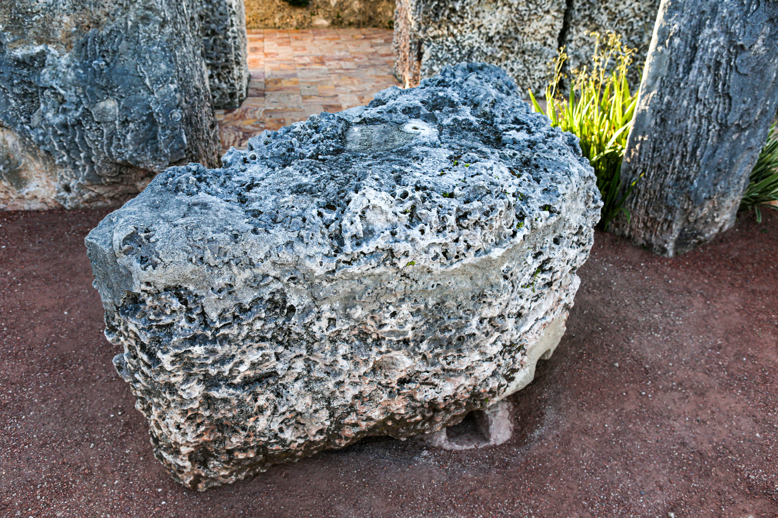 Beyond the front entrance, a three-ton triangular coral rock gate is positioned to rotate 360 degrees. Its exact balance enables effortless rotation in both directions. A central circular opening on the top, allows for oil lubrication of the gears. A square recess is located at the bottom point.